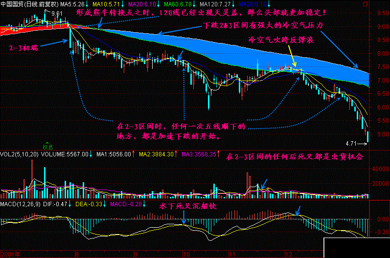 第121节:均线2+3(5) 当股价经过“牛熊转换点”之后,就进入了“下跌2&3初端”、“下跌2&3中端”、“2-3中端”了。