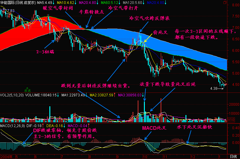 “下跌2&3区间”和“2-3区间”是股价主要的下跌区间,在这个区间内的任何敢于挑战冷空气带的反弹,绝大部分都将夭折。