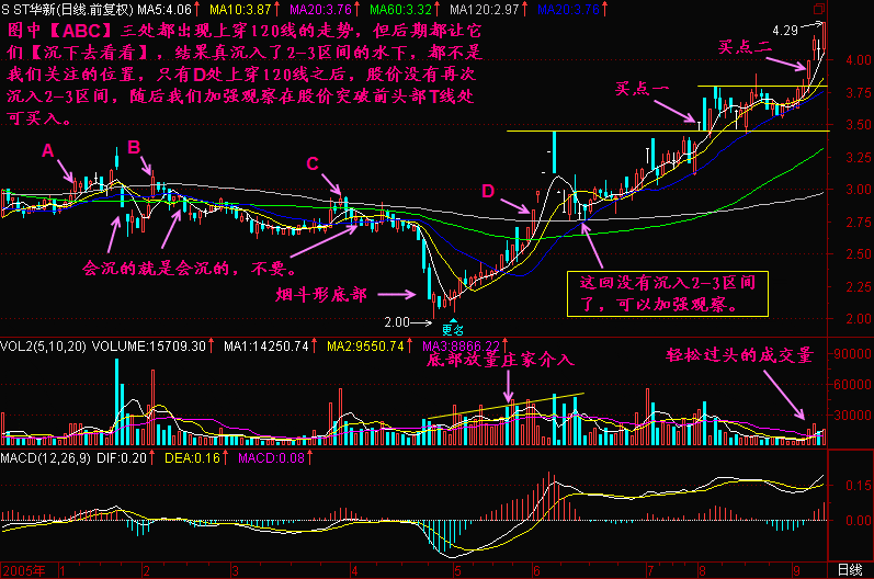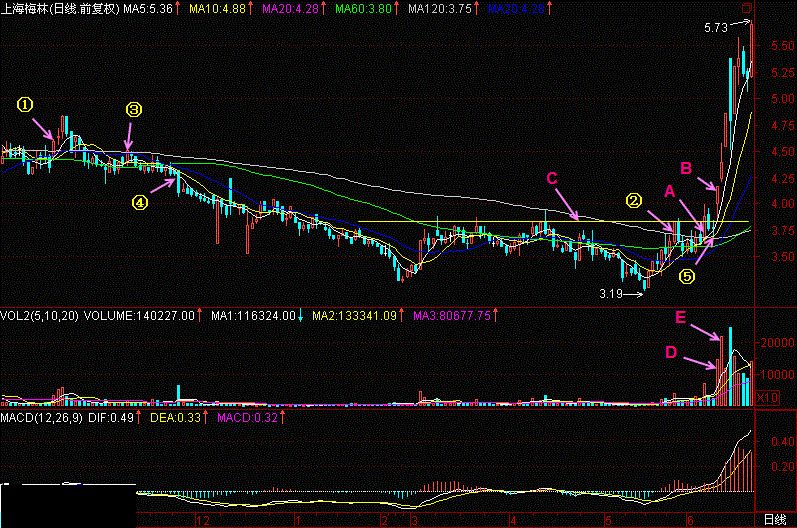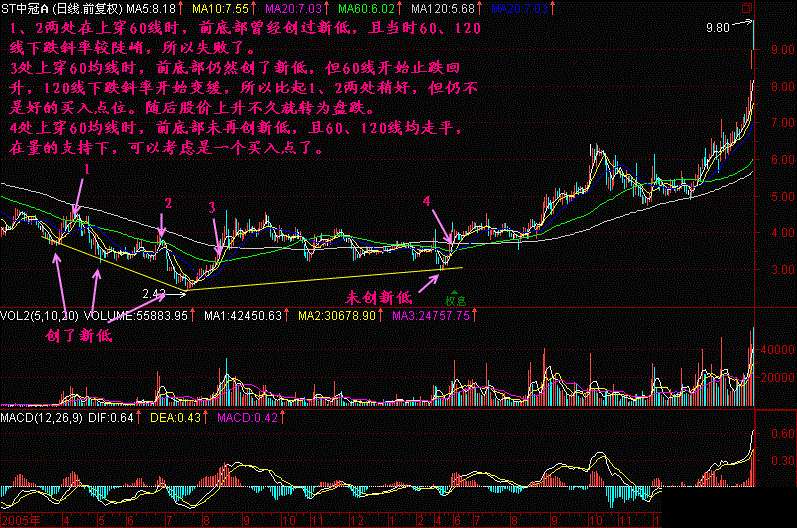 当股价处于“2-3区间”时,每一次形成五线顺下,都是一个暴跌的开始,尤其以三死叉为最,每次在2-3区间形成三死叉,都能诱发一轮暴跌,如果每一次暴跌都能创新低,那么跌势还未结束,或者说还处于“2-3中端”,一直要跌到什么时候不创新低了,那才可能是“2-3末端”,而“2-3末端”仅仅是跌势趋缓,有可能筑底的区间,至于筑底以否,还取决于是否有庄家在低位介入,如没有庄家介入,也仅仅是一个阶段性构筑的自然底部而已,并不会爆发行情。