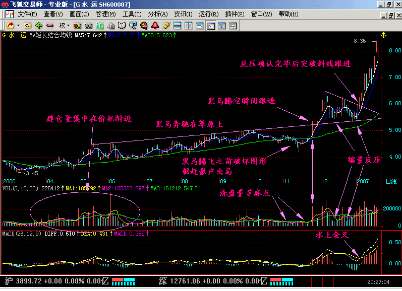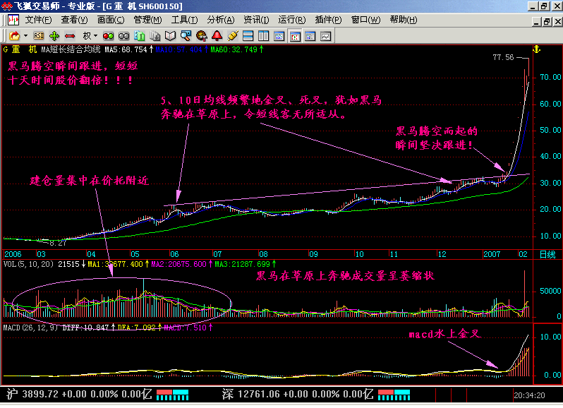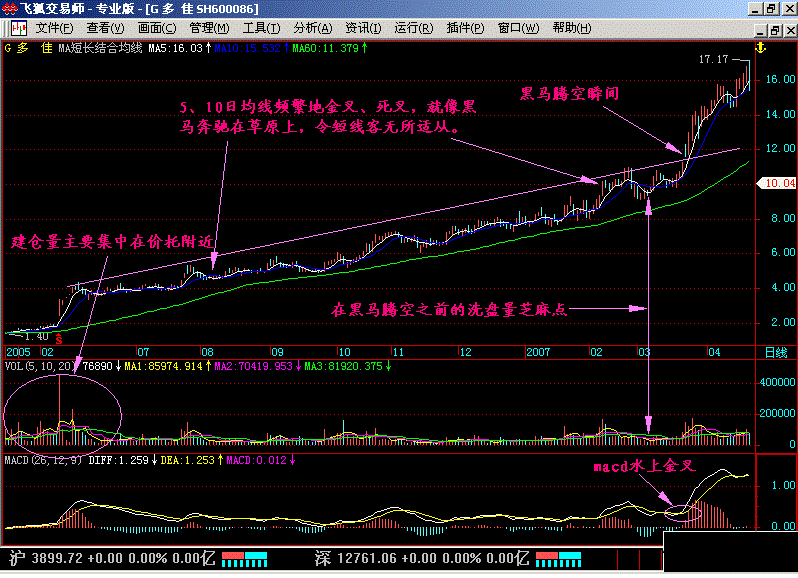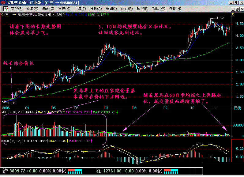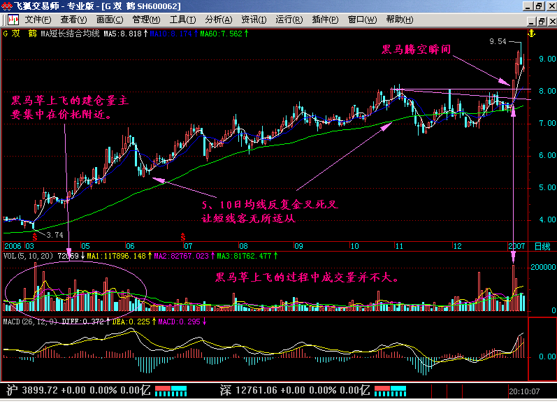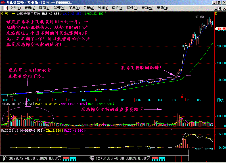 黑马草上飞是庄家在低位的价托处大量建仓,然后在逐步地推高股价的过程中高抛低吸,他掌握了完全的主动权,可以在黑马奔驰在草原上的地方不断地做差价来获利,因为只有他知道什么地方要买,什么地方要卖,股价被他玩弄于股掌之间,其余的短线客很难在其中做差价获利。