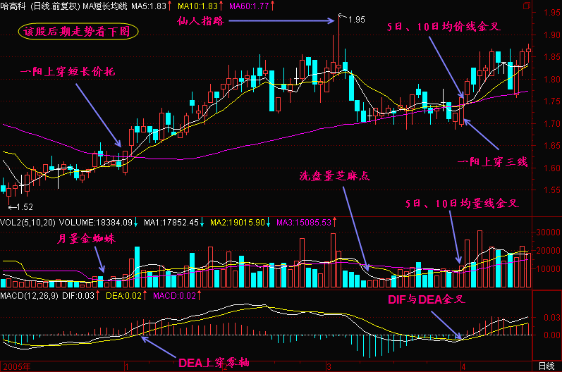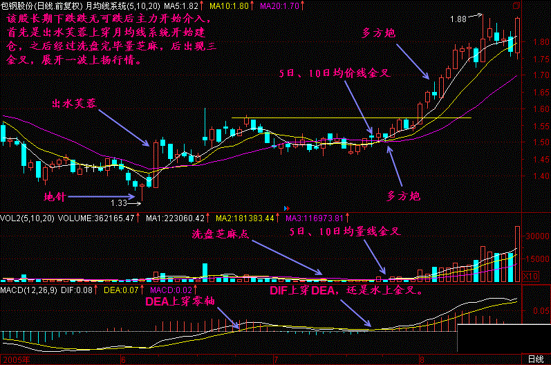 (1)股价在长期下跌后开始启稳筑底,而后股价缓慢上升。有时会同时出现5日、10日均价线、5日、10日均量线和MACD的黄金交叉点,这是股价见底回升的信号。
