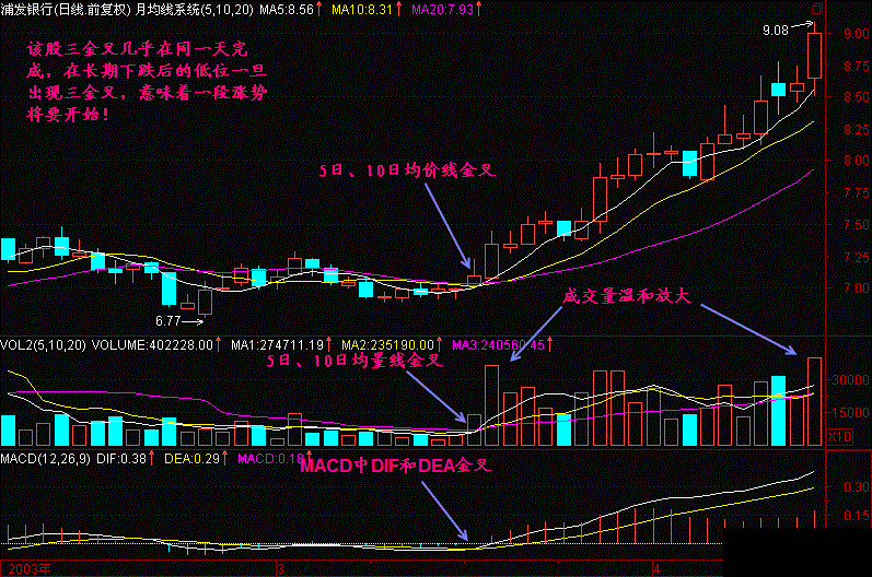 三金叉说明价格、量、MACD都在一个时点附近同时发生良性共振,一般情况下都有一波上扬行情。