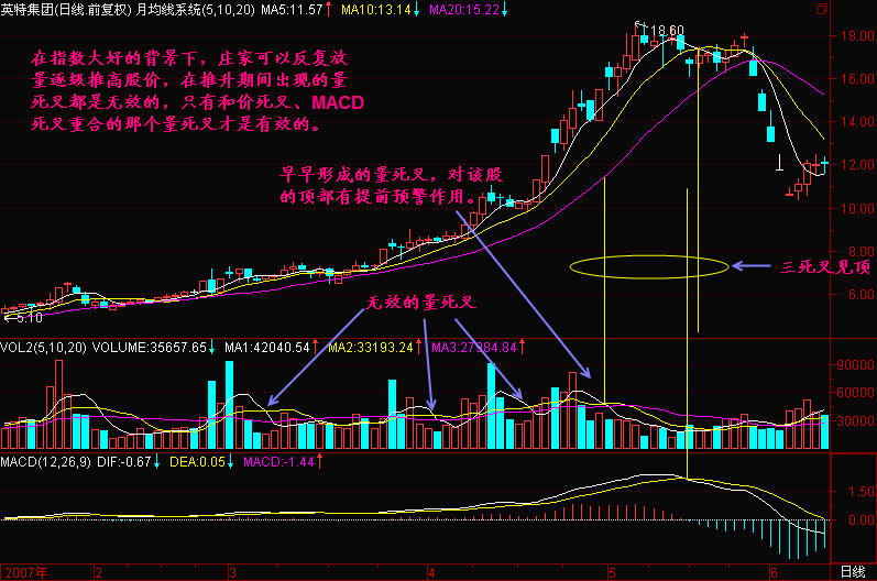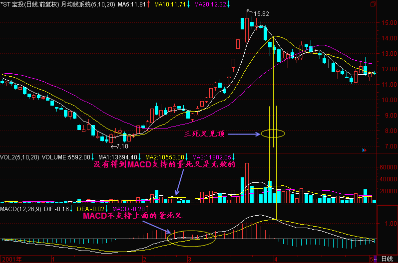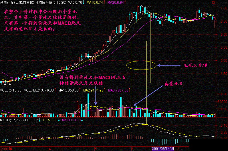 由于主力停止向上收集筹码,成交量开始萎缩,于是出现成交量的死亡交叉。而此时价死叉或MACD死叉并未形成,也就是它们不支持三死叉见顶的结论。