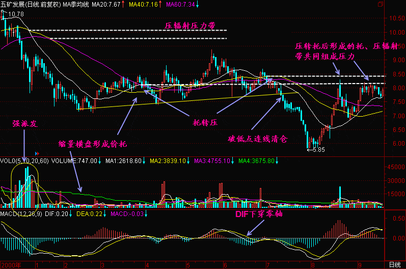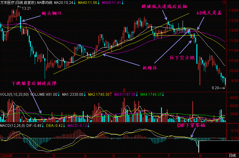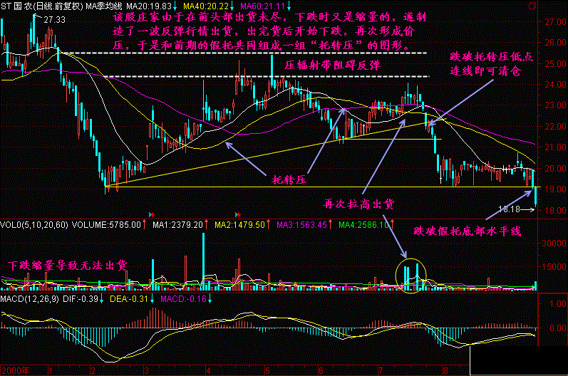 (4)由价托转化为价压其中需要经过一个8字形麻花结,股价常在这里重新跌破三条均线。