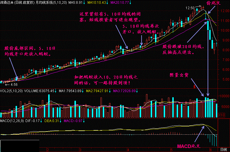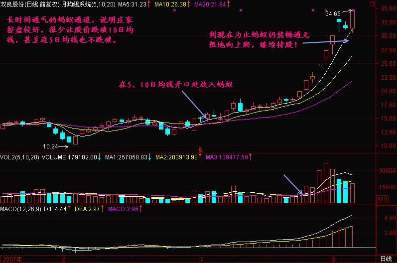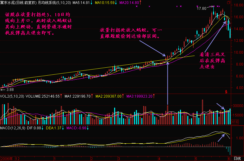 以后发现股价上升时尽管有波动,但总体上浮在5日、10日和20日均线上运行,走势强的个股在上升过程中连5日均线都不碰。中等强势股虽有盘中破5日均线,但收盘价仍能浮在5日均线之上。一般股票有时破5日均线和10日均线,但在5日均线和10日均线不死亡交叉前仍能维持股价安全。由此我想出一个办法,想象捉一只蚂蚁放在5日均线和10日均线之间爬行,只要蚂蚁还能往上爬就持股不动。对于中线投资者来说可把蚂蚁放在10日均线和20日均线之间爬行,这样显得更稳定。