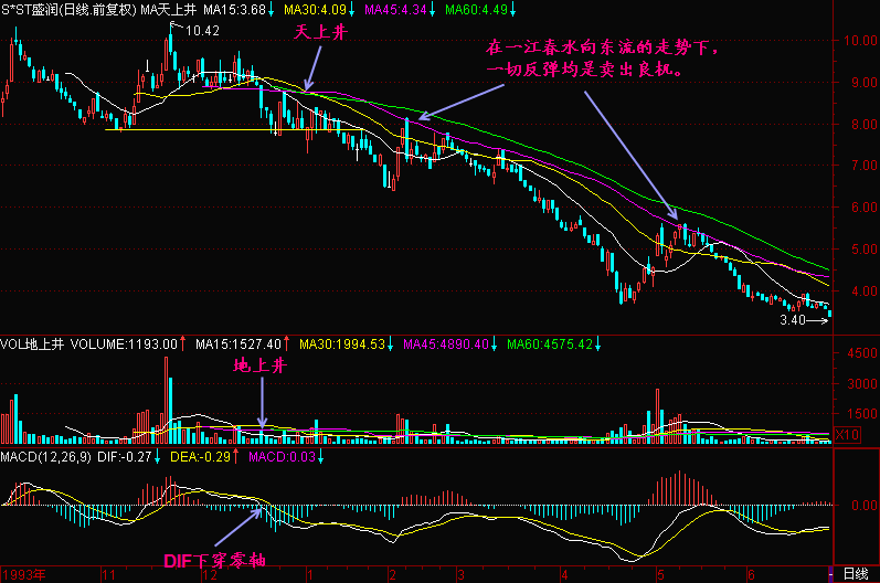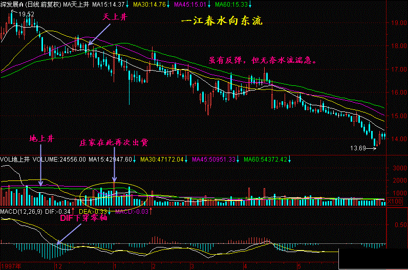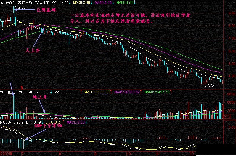 一江春水向东流的走势说明均线、K线之间呈均速下跌,等距下跌,这样的下跌行情不容易获得抢反弹资金的青睐,所以导致股价一路下滑,直到加速下跌时才可能有人来抢反弹,而中线介入的机会要等待股价不创新低了,有资金进入导致创新高了,才可能有机会。