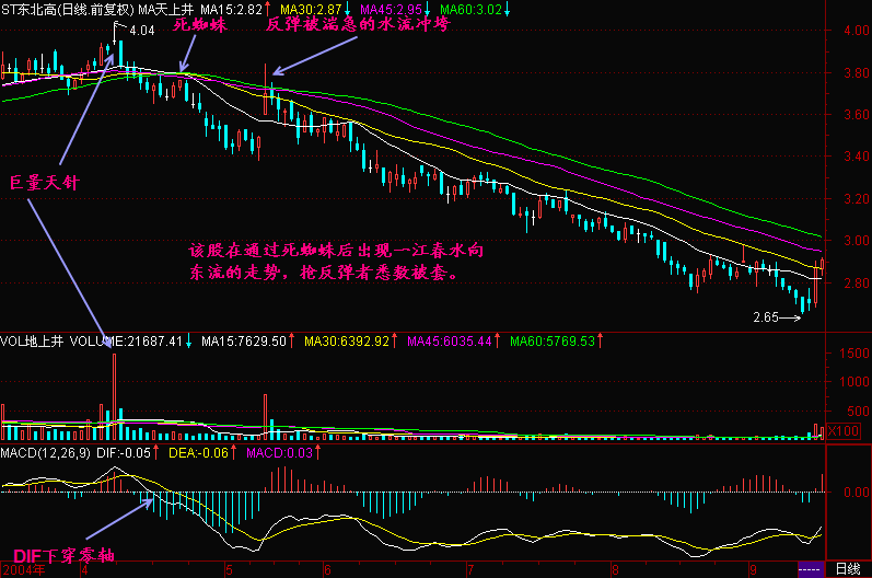 通过以上分析,短线高手应回避“一江春水向东流”的走势,你在任何价格买入顶多抢一个微小反弹,而更多的是在“一江春水”中受潮。好在目前沪深两市的股票越来越多,即使在指数“一江春水向东流”的跌势中也能发现一些逆流而上的强势股,有时甚至价量齐涨,均线多头排列,这里才是短线高手的乐园。