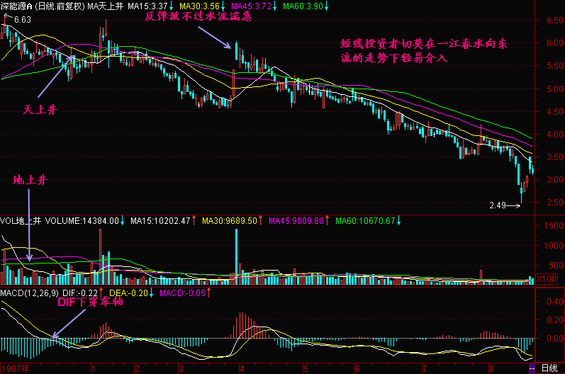下面我们的例子选用《短线是银》之一的“天上井、地上井”参数来展现“一江春水向东流”的走势,即均价线为“15日、30日、45日、60日”。