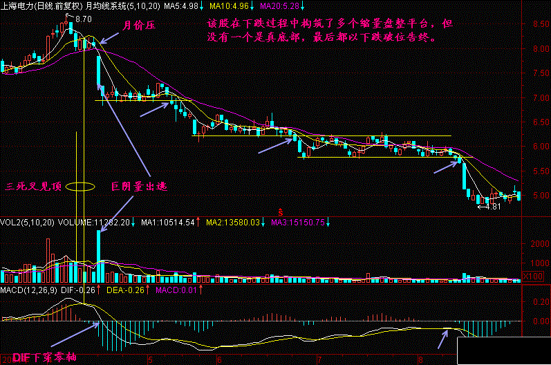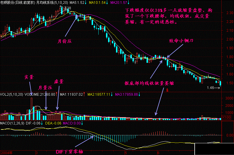 “一江春水向东流”的跌势还是容易识别和操作的。很多个股在下跌的过程中会出现无量盘整,其下跌速度减缓、成交量的萎缩以及均线系统的收敛都会使操作者误认为个股底部正在形成。