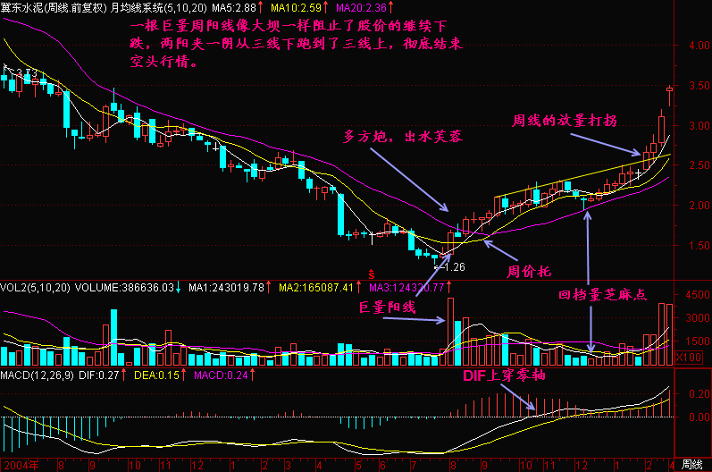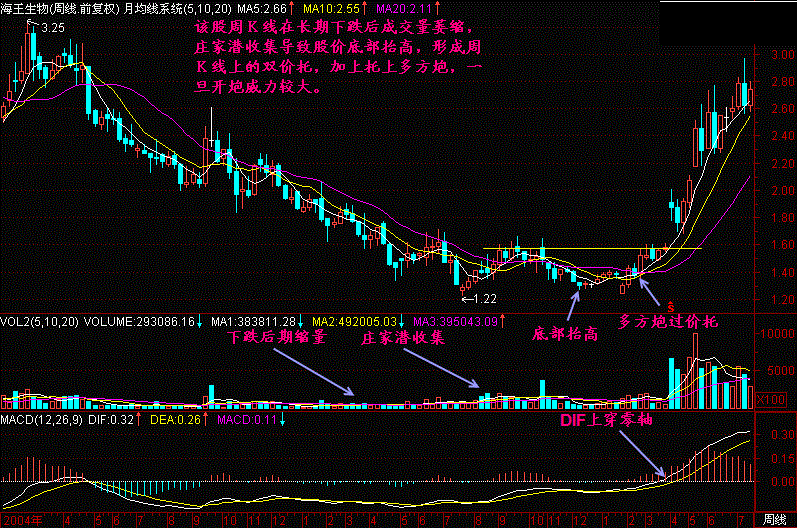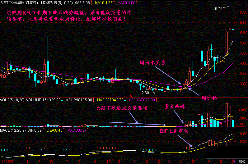 (6)周K线上5周、10周、20周均价线“托”和5周、10周、20周均量线托更有底部确认作用。