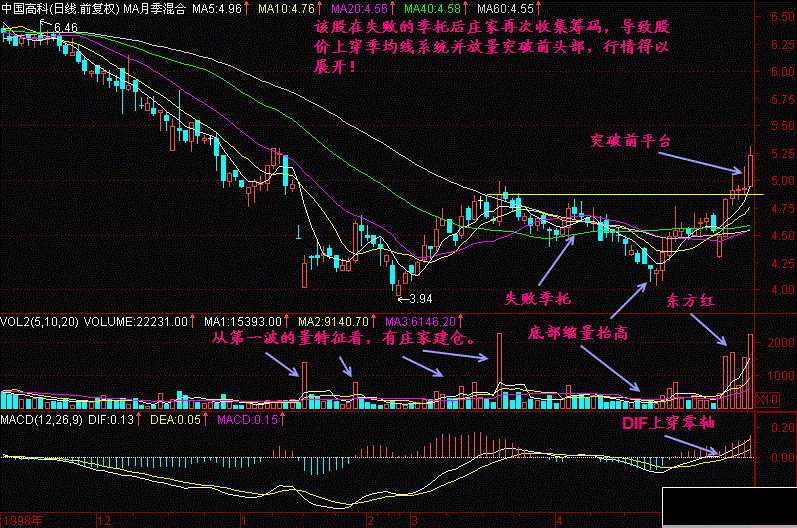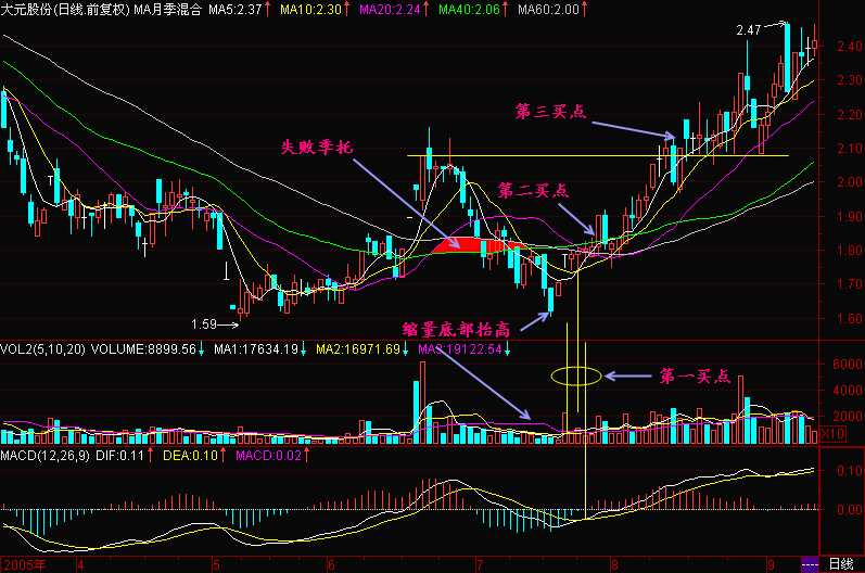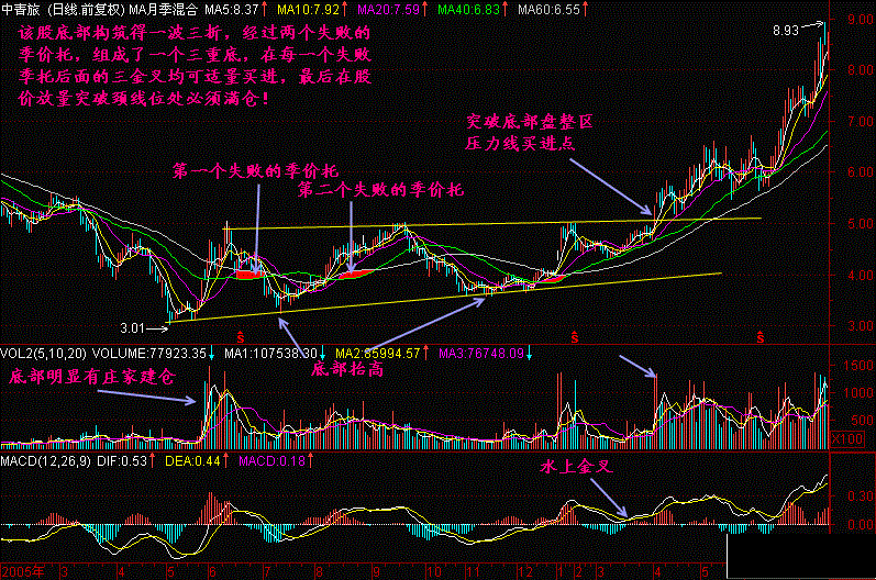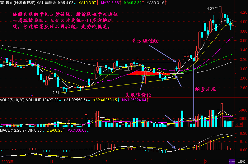 操作方法:判断好指数确实下跌空间不大的情况下,专门寻找那些失败的季托,要求第一波构筑季托时的成交量要稍有放大,只有放量才能证明有庄家收集,在跌破季托后最好能底部抬高,并且量萎缩,在判断好是失败的季托后按下面的方法操作。