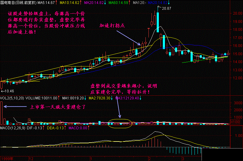 在股价初涨期,庄家一方面要收集足够的筹码,另一方面又不想股价涨得太快,涨得太快导致获利盘到高位可能全部倒给自己,于是庄家采用一种爬楼梯一样的走势,每涨到一个价位总是先盘整一段时间,让获利盘能够在这个盘整区间退出,让看好该股的投资者进入,而自己则不断地增加仓位,随着庄家仓位不断地增加,股价也已经不知不觉地爬高了,一旦股价突破建仓区压力线就会加速上涨。