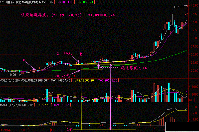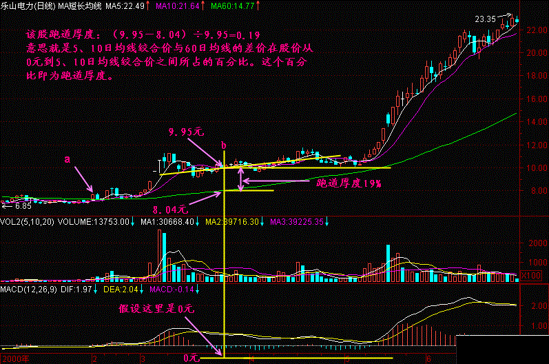 该股99年9月10日放量冲过60日平均价19.17元,而后继续上扬,直到99年11月1日股价冲高到23.20元才稍有回落。我们要等待其回落后,找出它的5日均线和10日均线绞合的均价(因为只有当股价冲高后回落,并进入横向震荡阶段,此时才能找出横向震荡中的平均价。而最能代表这个平均价的就是5日、10日均价的绞合处)。我们在b垂直线处得到5日、10日绞合处的均价为21.89元,60日均线为20.25元,那么【跑道厚度】等于(21.89元-20.25元)除以21.89元等于7.4%。乐山电力的【跑道厚度】比天津磁卡的【跑道厚度】厚。从一般的意义上来说,【跑道厚度】越厚的个股未来上升空间越大。
