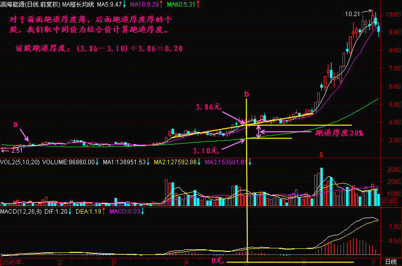 在(图70-1)中,我们在b垂直线处得到5日、10日绞合处的均价为9.95元,60日均线为8.04元,那么【跑道厚度】等于(9.95-8.04)除以9.95元等于19%。这是一个相对数,在一般情况下,这个数值越大,说明主力买进该股时的追涨决心越大,也意味着未来该股的上升空间越大。
