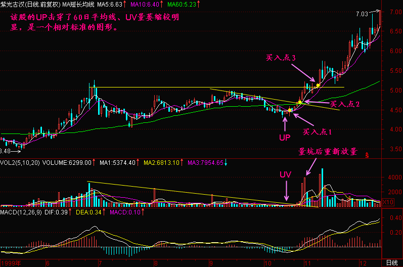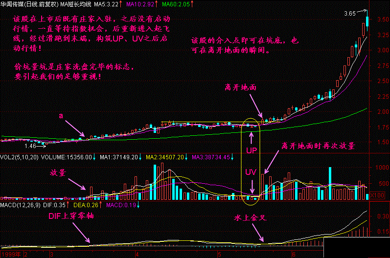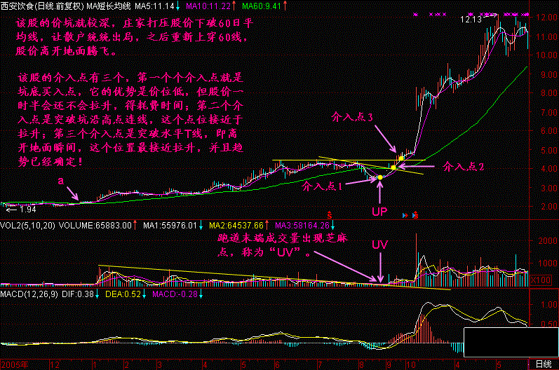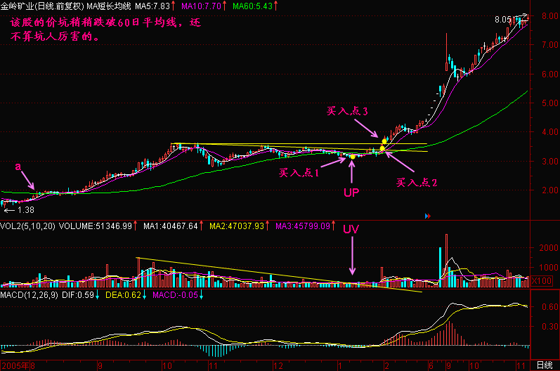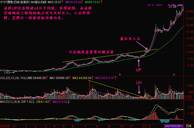 第73节:跑道坑UP与量坑UV 问:在机场的跑道上好像没见过【坑】,此乃何讲? 答:我们只是用飞机起飞时的一些过程,来想象股价启动时的情景,以便加深理解和记忆。 在跳高运动员的跑道终点有一块起跳板,运动员将在这里用力下蹲,增加跳高时的爆发力。此时起跳板承受很大的压力,久而久之,起跳木板中间会磨损出坑。飞机在经过滑行和加速滑行后,当其离开地面前对跑道会呈现很大的压力,所以在跑道的尽头,我们可以看到飞机轮胎留下的黑色的痕迹。跑道尽头是绝对不能有坑的,因为人们在铺设跑道时已经预先使用较好的材料或工艺,增加了跑道的强度,称为【预加强】。 股价在经过【滑行】和【加速滑行】后,在准备【离开地面】前,庄家往往会进行最后的【震仓洗盘】,以期最后赶走跟风盘。于是股价会有下跌。 图73-1 上图的价坑很浅,还不算坑人的。然而大部分庄家不会如此善良,他们会在股价拉升以前来一次大力度的【震仓洗盘】,于是留下一个很深的【UP】,这时候【价坑】的【坑】字,就是坑人的【坑】。 【价坑】的力度可以衡量,一般以【UP】底部是否击穿60日平均线为标准,下面这只股票的【UP】底部就击穿了60日平均线。见(图73-2)所示。 图73-2 图73-3 图73-4 图73-5 总结: (1)跑道坑【UP】与量坑【UV】是股价进入飞行线滑跑到末端时的重要特征,之后就离开地面,加速上升了。 (2)回档越浅的【UP】才越显强势,以不跌破60日平均线为好,跌破过深的需要多观察一段时间,最好等股价重新爬上60日平均线再寻找机会买进。 (3)对于构筑【UP】、【UV】的股票有三个买入点,第一个买入点是坑底量芝麻区买入点,该点位价位较低,但需要参与一段时间的盘整;第二个买入点是股价突破价坑上沿高点连线时买入,这个买入点由于股价已经重新爬起,有一定的稳定性;第三个买入点是股价突破跑道上轨或高点水平T线买入点,这个买入点由于确认了升势,避免了参加盘整,节约了时间,买入后股价即开始拉升,是最经济的买入点。 |