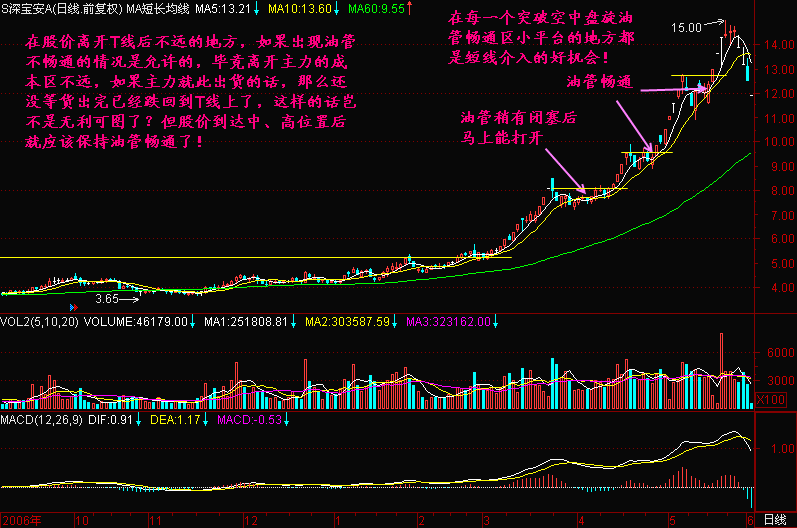 油路闭塞就可能演化为老鸭头等走势了,如果油路闭塞发生在离开T线不远的地方是允许的,因为主力获利还不丰厚,一出货就出到自己的建仓区了,等于无利可图!
