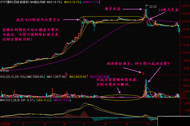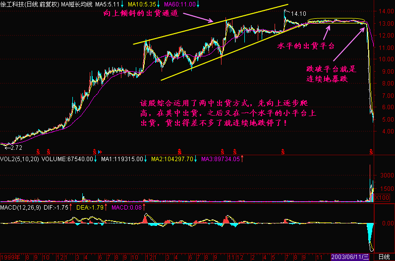 2:向上逐步爬高的出货通道,给人以一种蓄势的感觉,迷惑投资者,但股价最终会跌破通道下轨和60日平均线下跌;