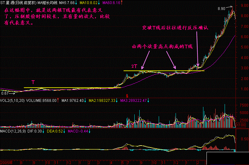 需要强调的是,T线会在股价上升中自动上移。但并不是每根T线都有代表意义,应该选取那些有量支持的、由较多根K线顶部所形成的T线。