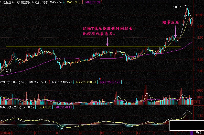 (1) 一定要选取有代表意义的T线,该T线要能压制住一段时间的股价,股价久攻不过,且每次碰到T线时都带量,就是说要选取有量支持的,能在一段时间内压制较多收盘价的T线,这样的T线才有代表意义;