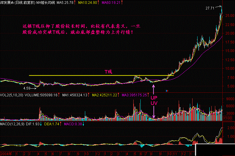 (4) 对T线的突破我们最好观察一下,如果之前出现过明显的【UP】和【UV】技术特征的,那么在突破瞬间可以马上追进,因为已经辨明了庄家控盘了!而之前没有这些特征的,就最好等待出现反压且不破T线的情况下,再追进。