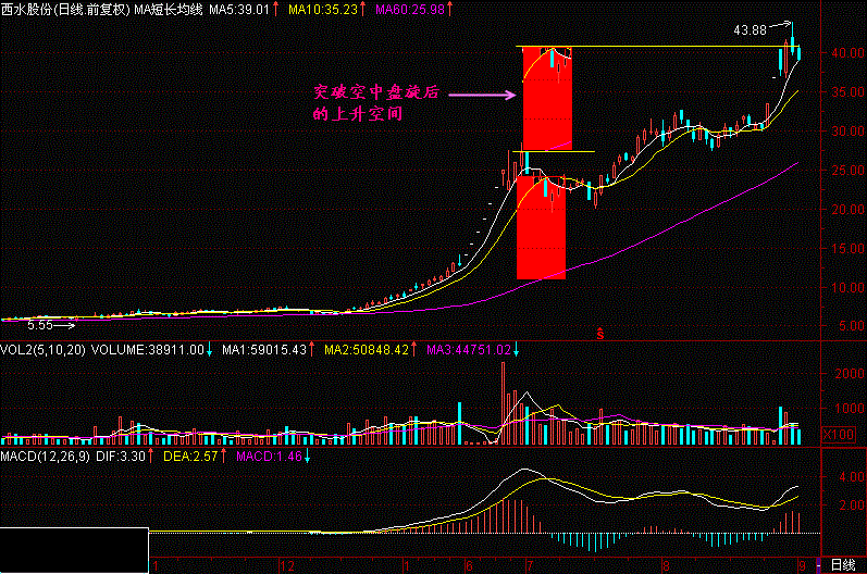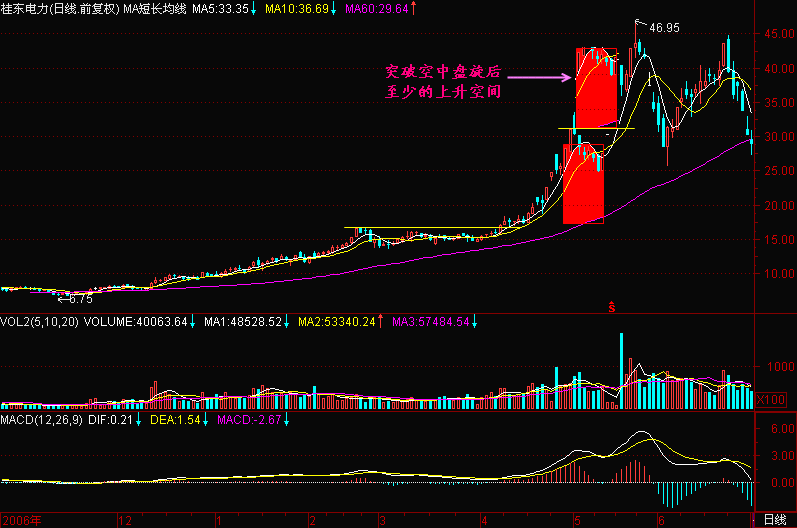 股价在空中盘旋位置的地方为主力洗筹,空中盘旋加油后股价才有继续上升的动力,那么股价在突破空中盘旋最高收盘价后的至少上升空间就是空中盘旋中心价位与60日平均线之间的距离,请注意这个是大概的估测,有时候在突破空中盘旋后涨势较为凌厉,很可能冲过头一些,这并不奇怪,一切都是庄家受拉高期巨大利益的驱动使然。