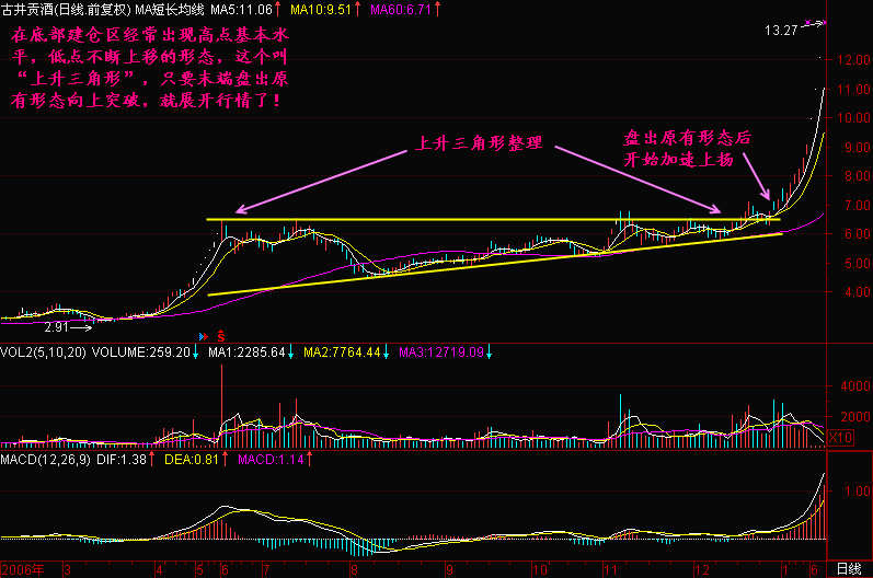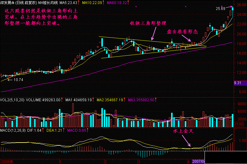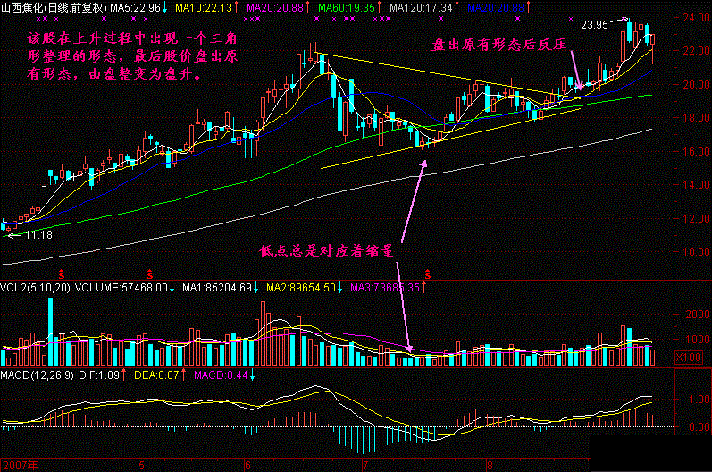 还有一点是需要注意的:对于三角形整理,如果整理到最末端仍然不能向上突破,那么走势较弱,即便后市突破涨幅也将有限。