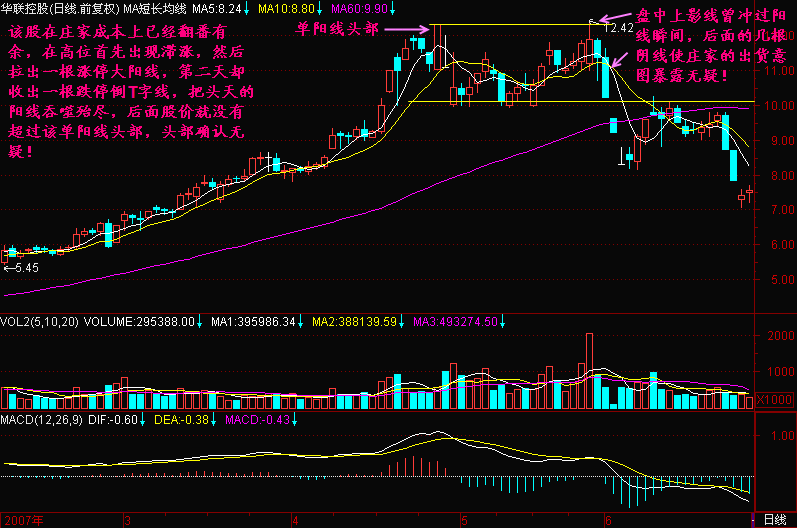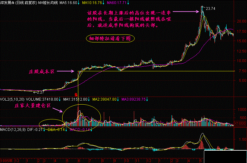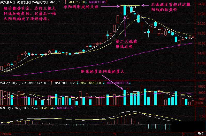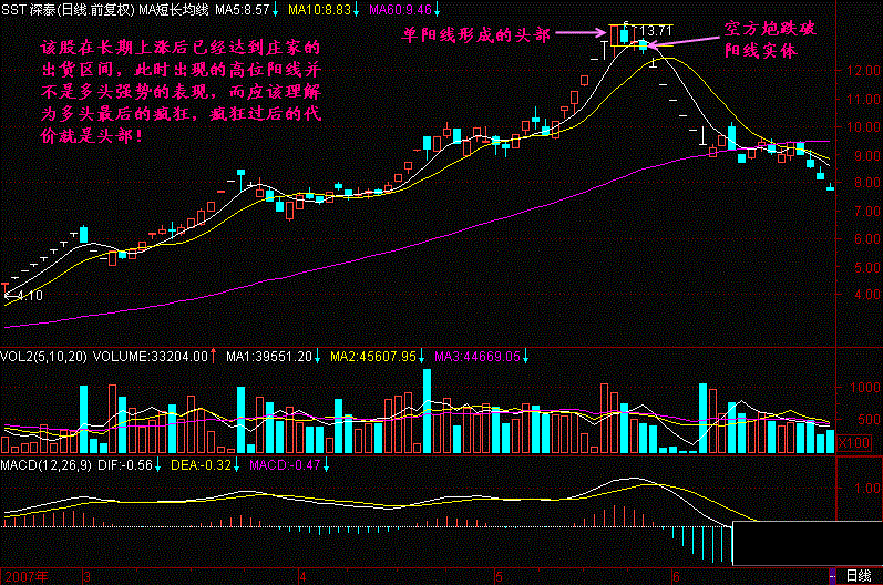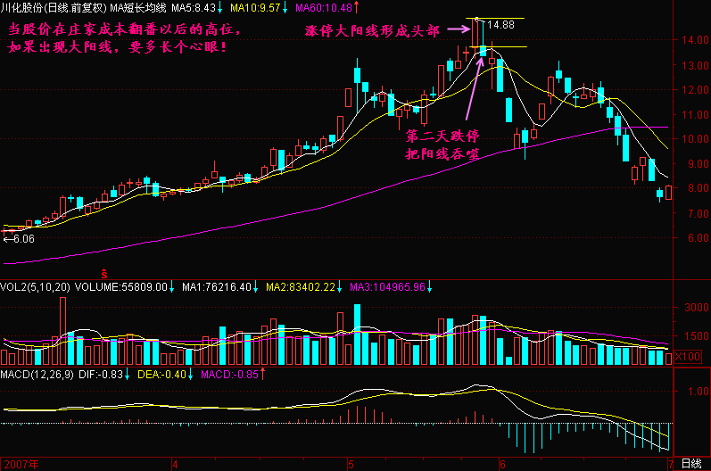 对于相对高位拉出的大阳线,只要后面很快被跌破,可认为主力已经撤退无疑!特别当出现三死叉等其它头部特征时,更可确认头部!