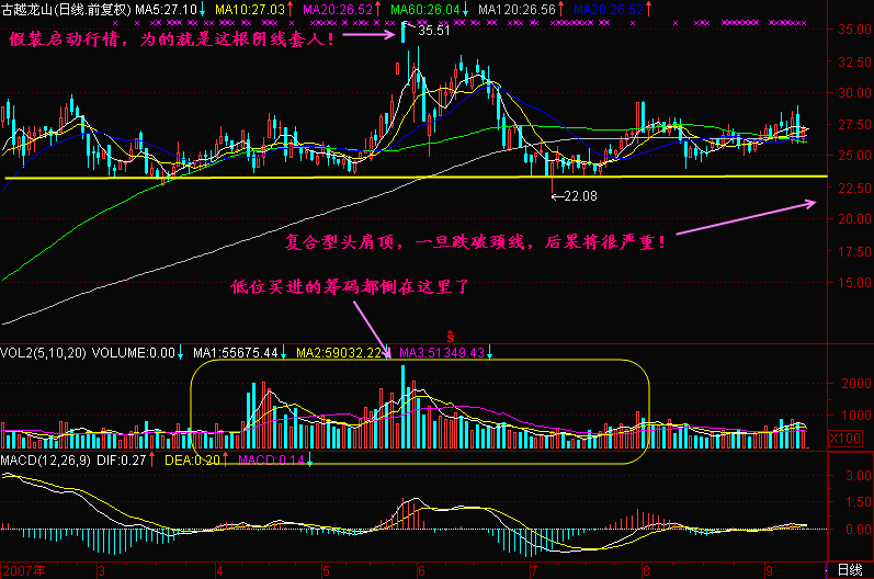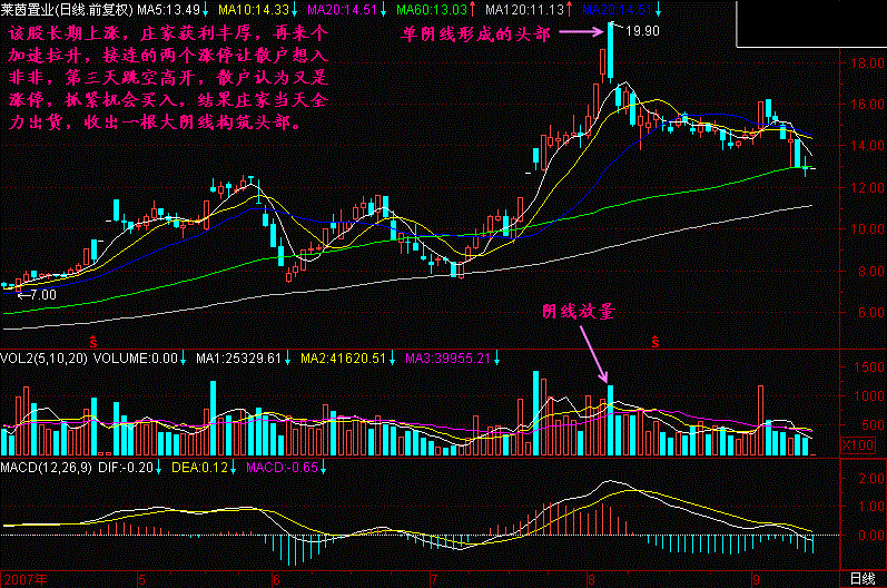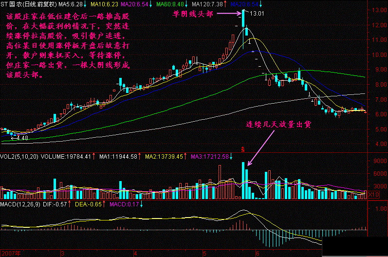 第93节:单阴线形成的头部 阴线表明在一天的成交过程中,空方力量较强,将股价从高位一路打压到低位,多方明显处于弱势。如此说来,阴线很容易形成头部? 这也要具体问题具体分析。在股价底部区间以及上升过程中,我们都可以找到很多阴线,但它们并不一定会形成头部。在股价接近头部的时候,多方强有力的攻击接近尾声,空方将从防御转化为进攻状态。这时候,反复出现的阴线就是空方进攻的过程。也就是股价形成头部的过程。 图93-1 图93-2 图93-3 图93-4 图93-5 一根阴线形成的头部有以下特点: |