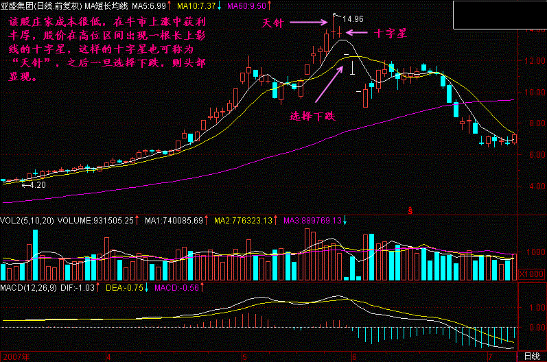 下图的个股由于十字星的上影线过长,再称为十字星就不妥了,那就称为“天针”。