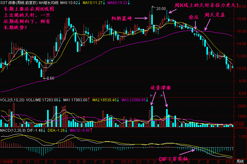 (4)股价高位出现的周十字星、周十字架和周天地针是稳定的头部信号。