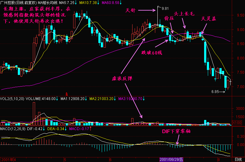 表面上看,一天下来收盘价等于开盘价,表明整天的多空力量是平衡的。实际上市场内部的结构在发生变化,庄家坚决做空,使股价拉出下影线,散户坚决做多,使股价拉出上影线,最终庄家的力量和散户的力量取得暂时平衡。原来高度集中的庄家筹码正在向高度分散的散户发散,当这种股价筹码由集中向分散进行到一定程度的时候,市场由强势转为弱势。量变引起质变,股价开始构筑头部。