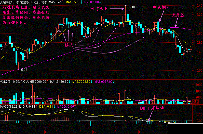 下面这只股票在庄家出货的高位出现很多锤头,再加上一个最高位的十字天针,可断定为头部区间!一旦股价跌破60日均线,则必须清仓!见(图96-2)所示。