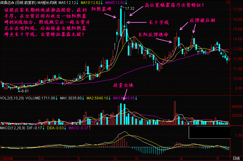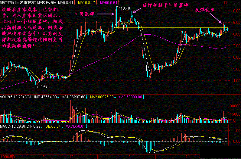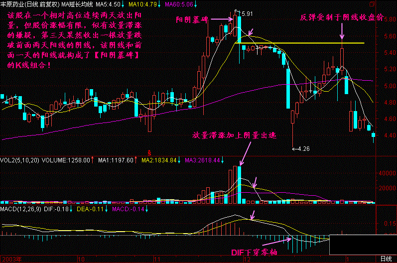 阳阴墓碑是使用阳线诱多,然后阴线杀跌套人的方式,如果出现在庄家获利丰厚的高位,则构成头部的可能性增大,一旦跌破60生命线,则头部成立。