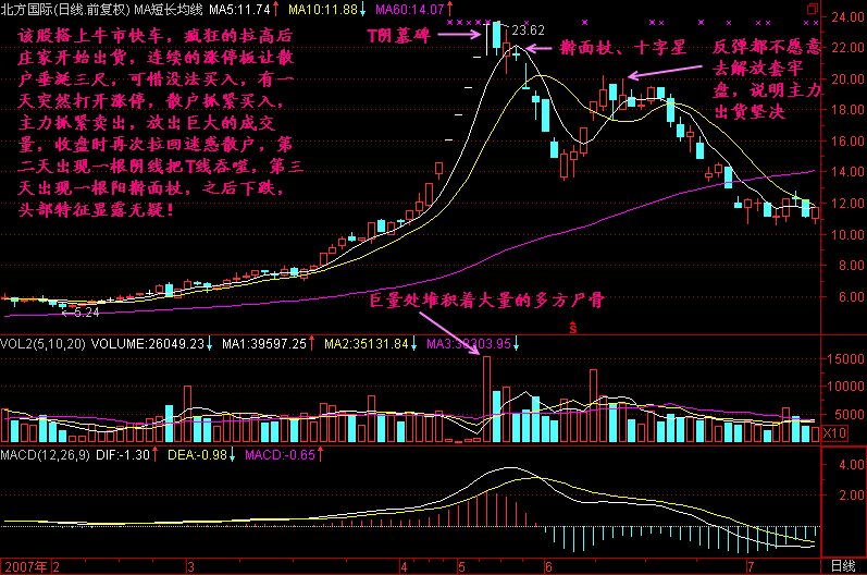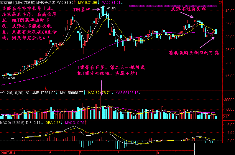 上图这种类型的T阴墓碑由于阴线开盘价比T线收盘价高,所以阴线好像从天而降,吃掉了T线,特别对于上图那样放巨量的T线,一旦被吞噬,说明有大量的散户可能被套在了T线上,反弹时一般不会超过T线的收盘价了。