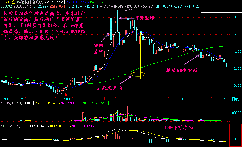 需要强调的是,在出现T阴墓碑等头部K线组合形态时,如果随后出现诸如“三死叉见顶”等信号时,则更能准确地把握头部!见(图99-2)所示。