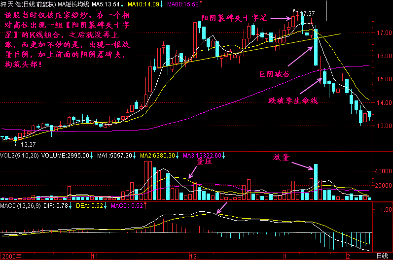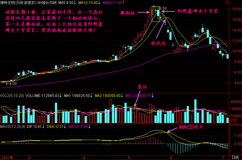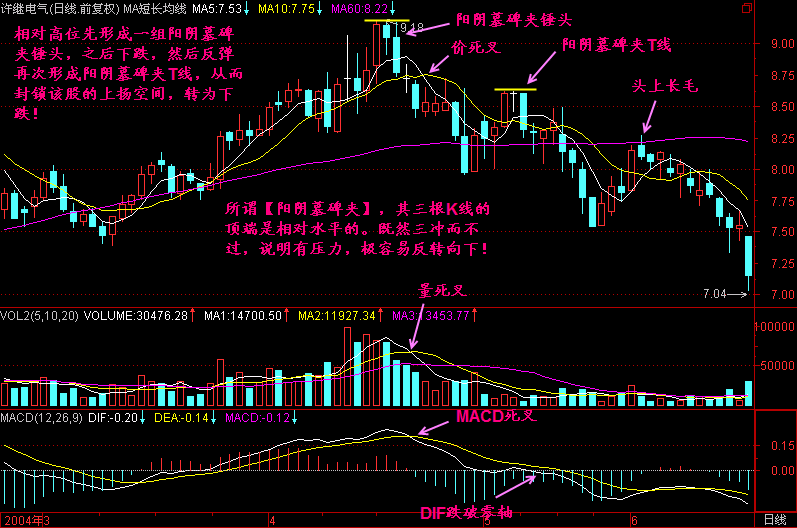 如果我们把【阳阴墓碑夹】中间的K线拿掉,那就是阳阴墓碑,阳阴墓碑就是头部信号了,如再加上“锤、星、针、杖”,则更加是头部了!
