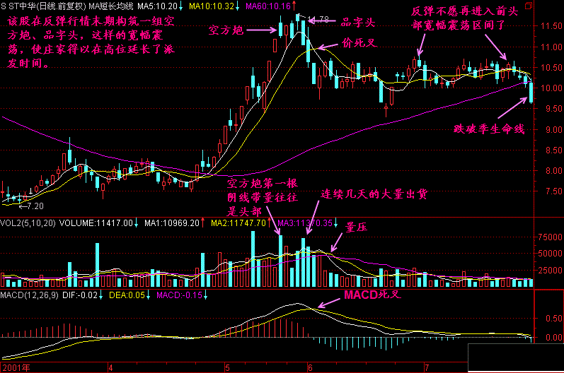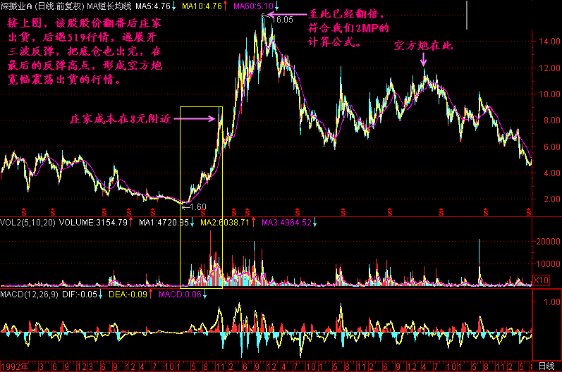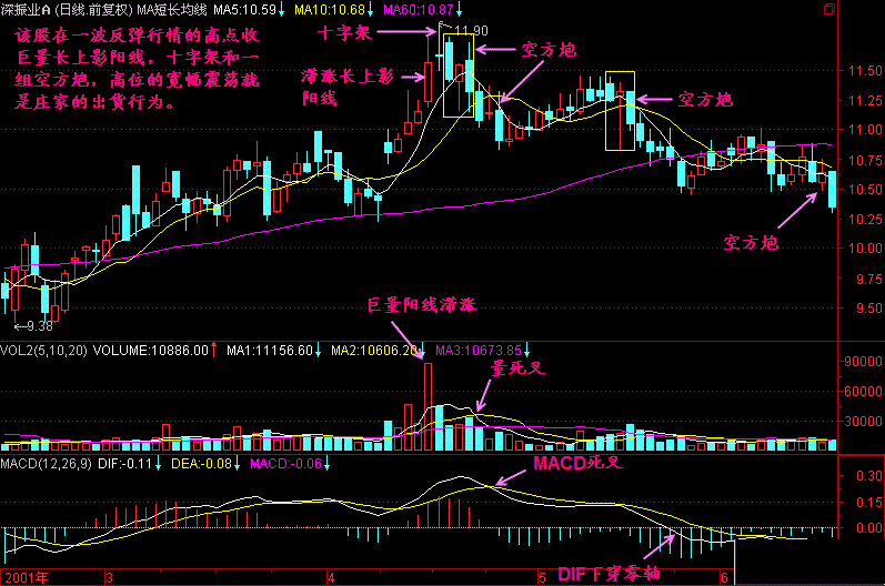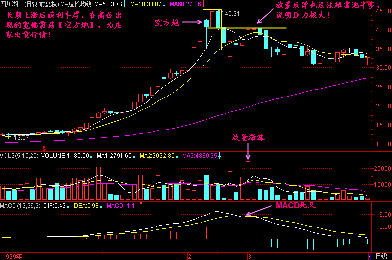 空方炮是股价宽幅震荡的结果,如果出现在庄家成本翻倍以后,则获利压力大增,这个时候出现空方炮的话,说明庄家已经在反复震荡中出货了!