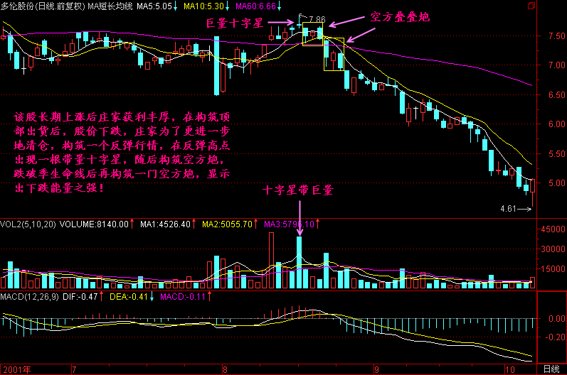 还有一种【空方叠叠炮】,就是连续出现两组甚至三组的空方炮,一般出现这样走势的个股,说明空方掌握了绝对的话语权,步步为营,股价将有长期下跌!