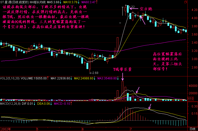 比如下面这只股票的【空方炮】,其第一根K线虽然是T线,但在盘中,它一定有一段时间确实是一根阴线,收盘之前又上去了,巨大的成交量你可以怀疑是主力建仓也可以怀疑是主力借宽幅震荡出货,但考虑到股价是反弹行情,那么如果后面两天的K线与之组合成【空方炮】的话,你就不应该再怀疑了,一旦向下开炮,反弹头部成立!