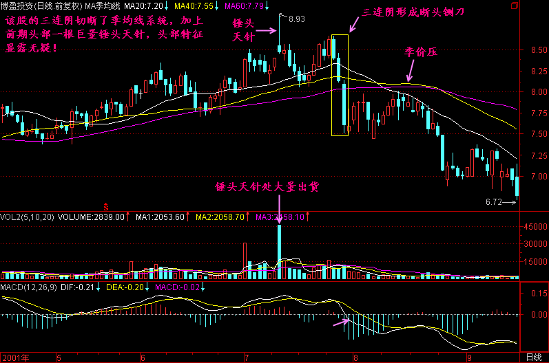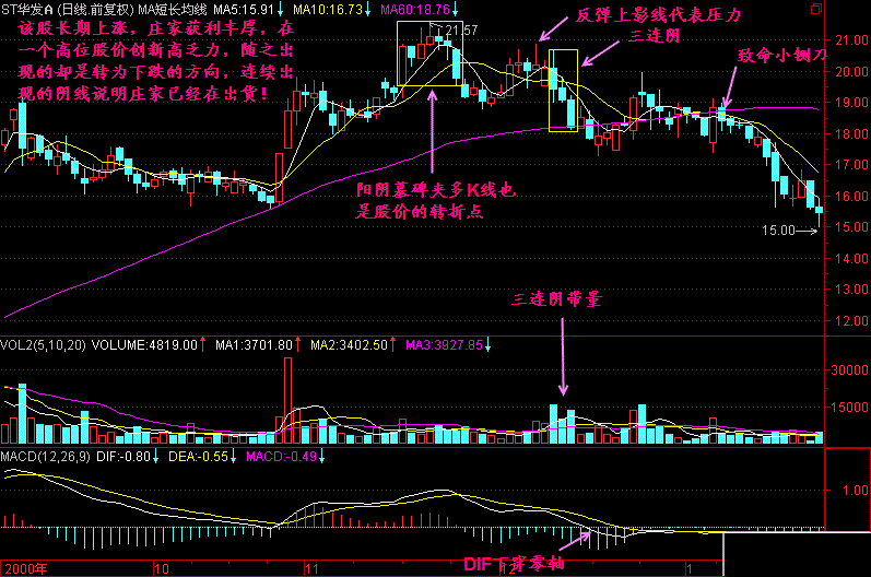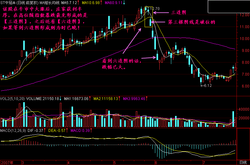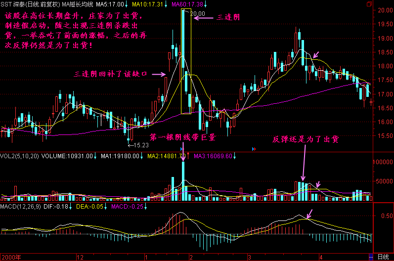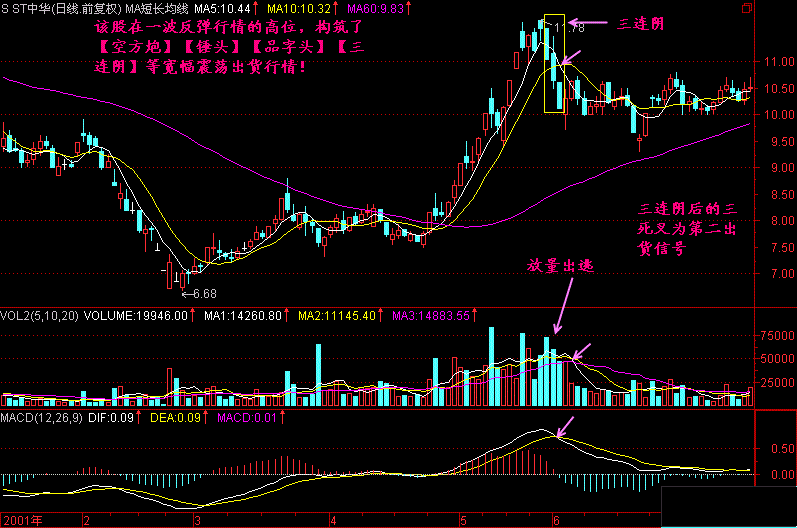 顺便提醒一下,在三连阴以后,一般都有三死叉见顶的信号,那可是最后撤退的机会。