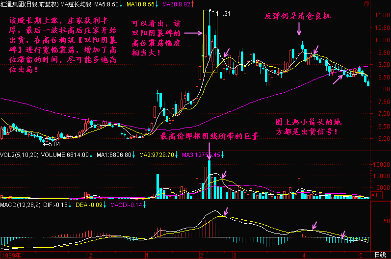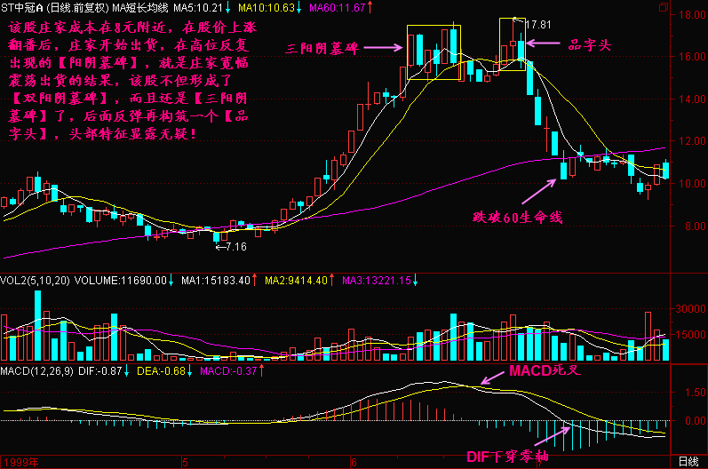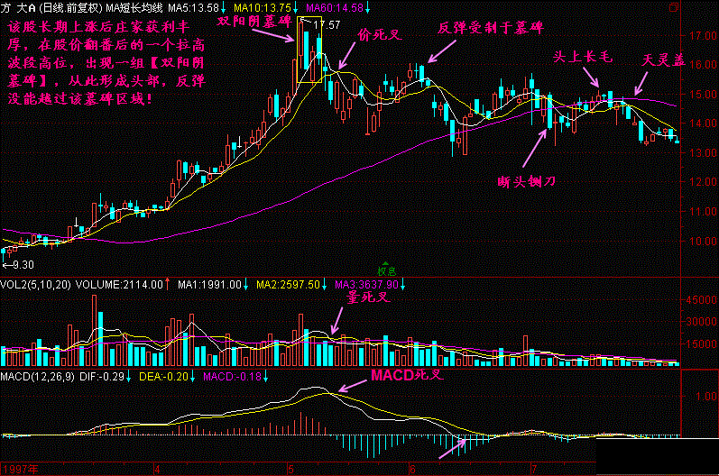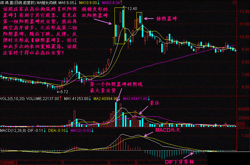 【双阳阴墓碑】显然比【单阳阴墓碑】的高位宽幅震荡时间要长,这样的话庄家就有更充分的时间进行高位清仓,如果再结合【三死叉见顶】、【季生命线】等头部特征一同研判的话,则对头部的判断将十分准确!