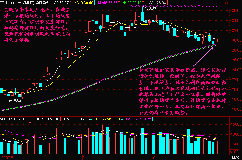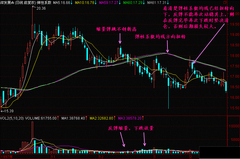 如果弹性系数均线系统扭转向下后,股价不能再回到均线之上,而是向下突破季线下平台的话,那就将出现中长期跌势了!
