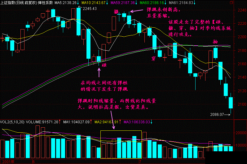 下图的上证指数2245点头部区间,在第一次跌至60线时,由于59日、60日和61日平均线之间有一定的距离,均线之间有一定的弹性,所以发生了弹跳,但通过观察弹跳时的幅度并没有创新高,且弹跳时阳线缩量,而下跌时阴线的量都比阳线的大,说明拉高是假,出货是真。