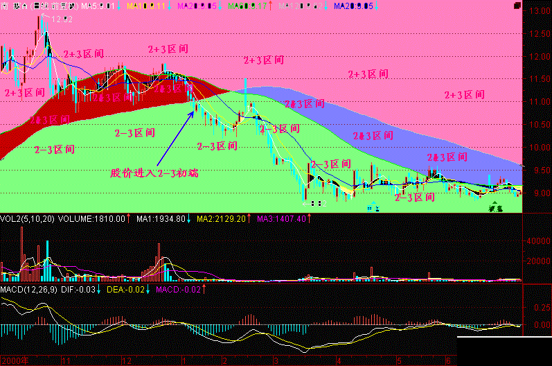 股价在“上升2&3末端”内的上下盘整,是庄家为了拖延出货时间而设计的,当庄家基本出货完毕后,不再照顾股价,此时股价很容易跌入到“2-3初端”,而股价一旦跌入“2-3初端”,就是持币的开始了,任何试图抢反弹的操作都是徒劳的,很容易再被套住。