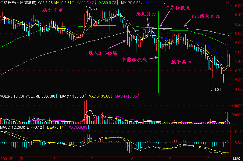 很多人的股票被套牢,被套得糊里糊涂,我是怎么被套住的?你不知道,你就是在【牛熊转换线】上被套住的,因为你过了这条线没有逃走。这样,我们就把牛市结束、熊市开始的点具体化了,任何股价只要形成头部,必然会有一个60日平均线和120日平均线的死亡交叉点。只要有这个点,我们就可把股价一分为二,前面的是牛市,后面是熊市。在前面的牛市中,你的损失比较有限,比如说你在最高点买进,只要【牛熊转换点】前卖出,损失还是有限的,如果在【牛熊转换点】不卖出,再往下跌损失就会很大。